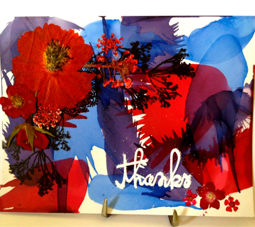 I used Alchol Inks, the colors Cranberry, Eggplant and Sail Boat Blue, placed drops on Shiney card stock and then used compressed canned air to move it around on the paper. I then stamped the floral images from Tim Holtz and a small Pink Paislee stamp using Versamark Black Onyx ink. Then placed dried and pressed flowers over the images. I stamped and embossed with White embossing powder, it got a bit messy but I like it anyways, kinda goes with the random inks. The technique is from Tim Holtzs compendium of Curiosities Volume 1.